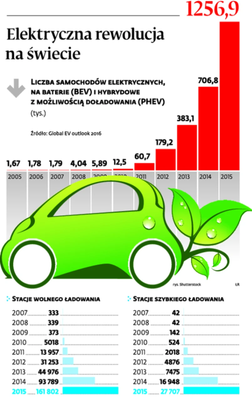 Obecnie według zgrubnych szacunków po polskich drogach jeździ ledwie 500 aut elektrycznych. Plan 1 mln elektrycznych aut w ciągu 10 lat można zatem potraktować jako nadrabianie zaległości, a nie jako ucieczkę przed peletonem. Na całym świecie jeździ ponad 1,2 mln samochodów elektrycznych, ale według agencji Fitch za 10 lat samochody elektryczne mogą stanowić połowię całej sprzedaży aut i ich udział będzie wzrastał. Sprzyja temu szybki rozwój technologii i większa opłacalność elektromobilnego biznesu. Fitch wskazuje, że od 2008 r. cena baterii spadła o prawie 75 proc.