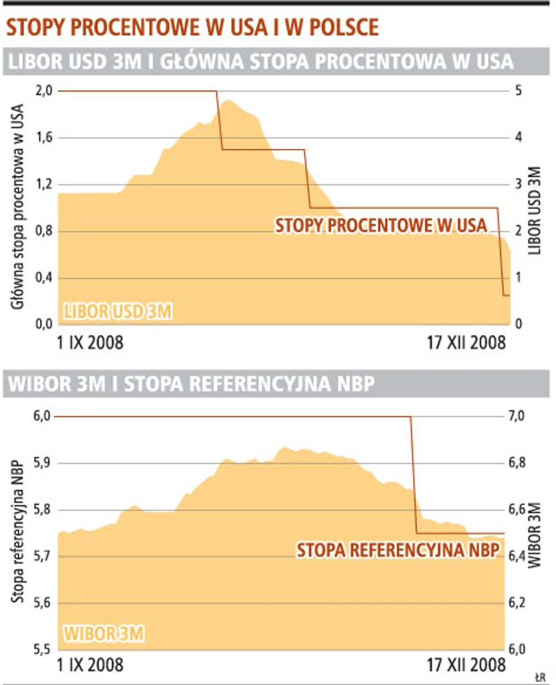 W ostatni wtorek amerykański bank centralny Fed obciął główną stopę procentowa do rekordowo niskiego poziomu - koszt pieniądza na amerykańskim rynku mieści się obecnie w przedziale od 0 do 0,25 proc. Ta dziesiąta w ostatnich 15 miesiącach obniżka stóp w USA wpisuje się w ogólnoświatową tendencję łagodzenia przez banki centralne polityki kredytowej, co ma ożywić gospodarkę. Na skutek kryzysu płynności banki komercyjne od USA po Japonię niemal zaprzestały udzielania kredytów, co wpędziło w kłopoty wiele firm i indywidualnych klientów banków. Jednak zdaniem ekonomistów nawet tak radykalne ożywienie stóp nie przełoży się w krótkim czasie na wzrost akcji kredytowej.