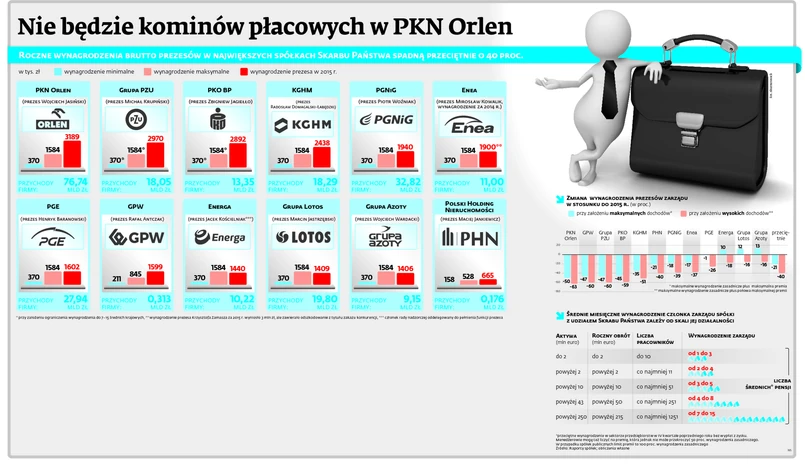 Przyjęta w czerwcu nowa ustawa kominowa wyznacza górną granicę podstawowych zarobków członków zarządów spółek z udziałem Skarbu Państwa na poziomie 15-krotności średniego wynagrodzenia w sektorze przedsiębiorstw, ale zostawia akcjonariuszom furtkę – jeżeli przemawiają za tym wyjątkowe okoliczności dotyczące spółki lub rynku. Posiadające decydujący głos na walnym Ministerstwo Energii nie skorzystało z niej. Maksymalne zasadnicze wynagrodzenie prezesa Jasińskiego ustalono na niecałe 800 tys. zł, z możliwością jego podwojenia w postaci premii. Prezes Orlenu może liczyć na niecałe 25 proc. tego, ile otrzymał w 2015 r. szef działającego w tej samej branży austriackiego OMV.