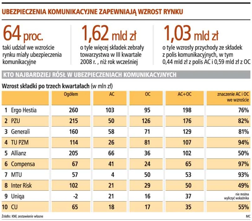 Liczba nowych samochodów wzrośnie o około 9 proc., co widać we wzroście przychodów z ubezpieczeń AC. Przedsiębiorcy wydali na nie o 308 mln zł więcej niż rok wcześniej. Dla segmentu klientów indywidualnych było to 142 mln zł więcej. Do wzrostu popytu na polisy OC przyczynił się zalew używanych aut (od początku roku do listopada sprowadzono ich ponad 1 mln). Na te więcej wydali klienci indywidualni (wzrost o 412 mln zł) niż firmy (wzrost o 169 mln zł). 2009 rok może już nie być tak dobry, bo i do nas dotrze fala spadków sprzedaży nowych aut. Nie wiadomo też, czy rząd nie wprowadzi tzw. podatku ekologicznego, który zmniejszyłby opłacalność sprowadzania aut używanych.