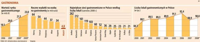 Jeśli w przyszłym roku nastąpi spowolnienie, to branża gastronomiczna je odczuje. Może się okazać, że dla polskiej gastronomii większym problemem niż kryzys na rynkach finansowych okaże się brak przygotowania na naturalne wyhamowanie rynku, które może nastąpić po ostatnich kilku latach gastronomicznego boomu. W minionych latach wiele firm gastronomicznych podejmowało decyzje o intensywnej ekspansji i dynamicznym rozwoju. Inwestowały znaczne środki w otwieranie kolejnych lokali, wiele firm zadebiutowało na GPW i New Connect lub przynajmniej rozpoczęło przygotowania do debiutu. Rynkiem gastronomicznym zainteresowały się firmy z innych sektorów, doszukując się w nim atrakcyjnych możliwości inwestycyjnych. Rynek kawiarni rozkwitał w imponującym, ale trochę niepokojącym tempie. Wzrosły koszty prowadzenia działalności gastronomicznej - szczególnie wysokość czynszu najmu lokali. Niektóre firmy przeceniły swoje możliwości. Ruch, który w minionym roku intensywnie rozwijał sieć kawiarni, przyznaje, że ma z nią kłopoty i rozważa sprzedaż sieci. Zapowiadanych planów ekspansji nie realizują też inne sieci, jak chociażby Costa Coffee. Opóźnia się debiut światowego giganta Starbucks na polskim rynku.