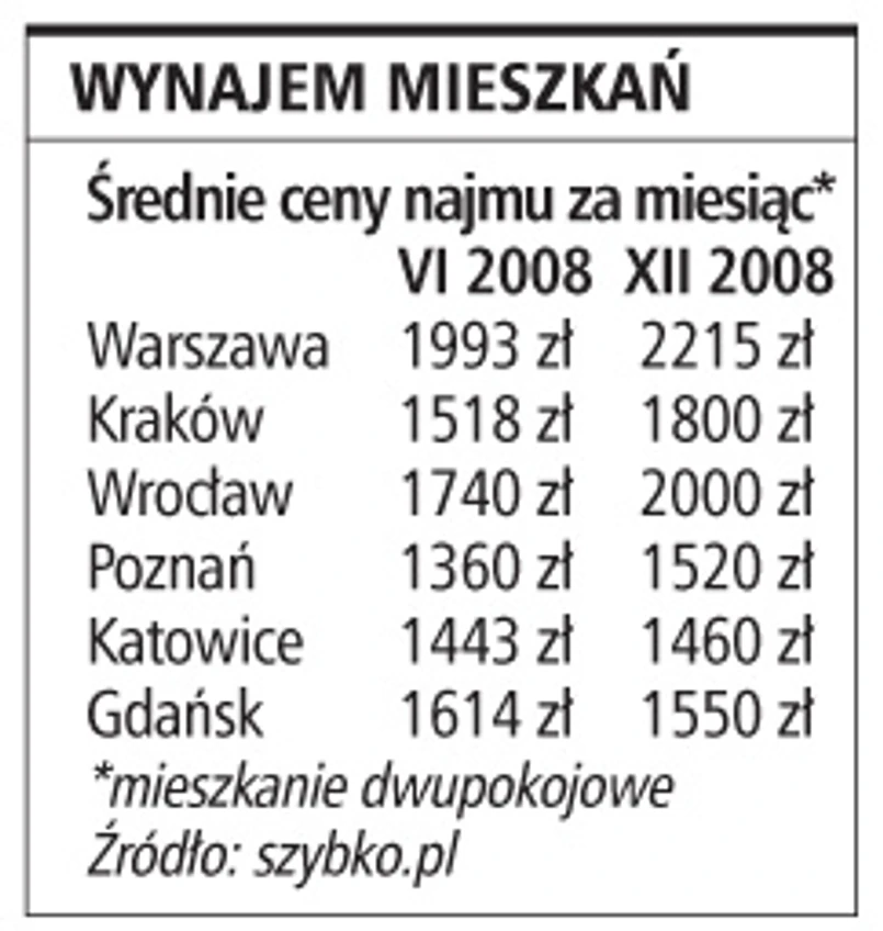 Najbardziej drożały czynsze najmu mieszkań największych. Lokale czteropokojowe zdrożały średnio o 16 proc. Wiele osób, nawet dobrze zarabiających, utraciło zdolność kredytową i nie może liczyć na pożyczkę w banku. Z drugiej strony klienci, którzy nie mają z tym problemu, nie decydują się na kupno mieszkania, licząc na dalszy spadek cen. W efekcie mamy stosunkowo niewiele transakcji kupna nieruchomości i rosnący popyt na najem.