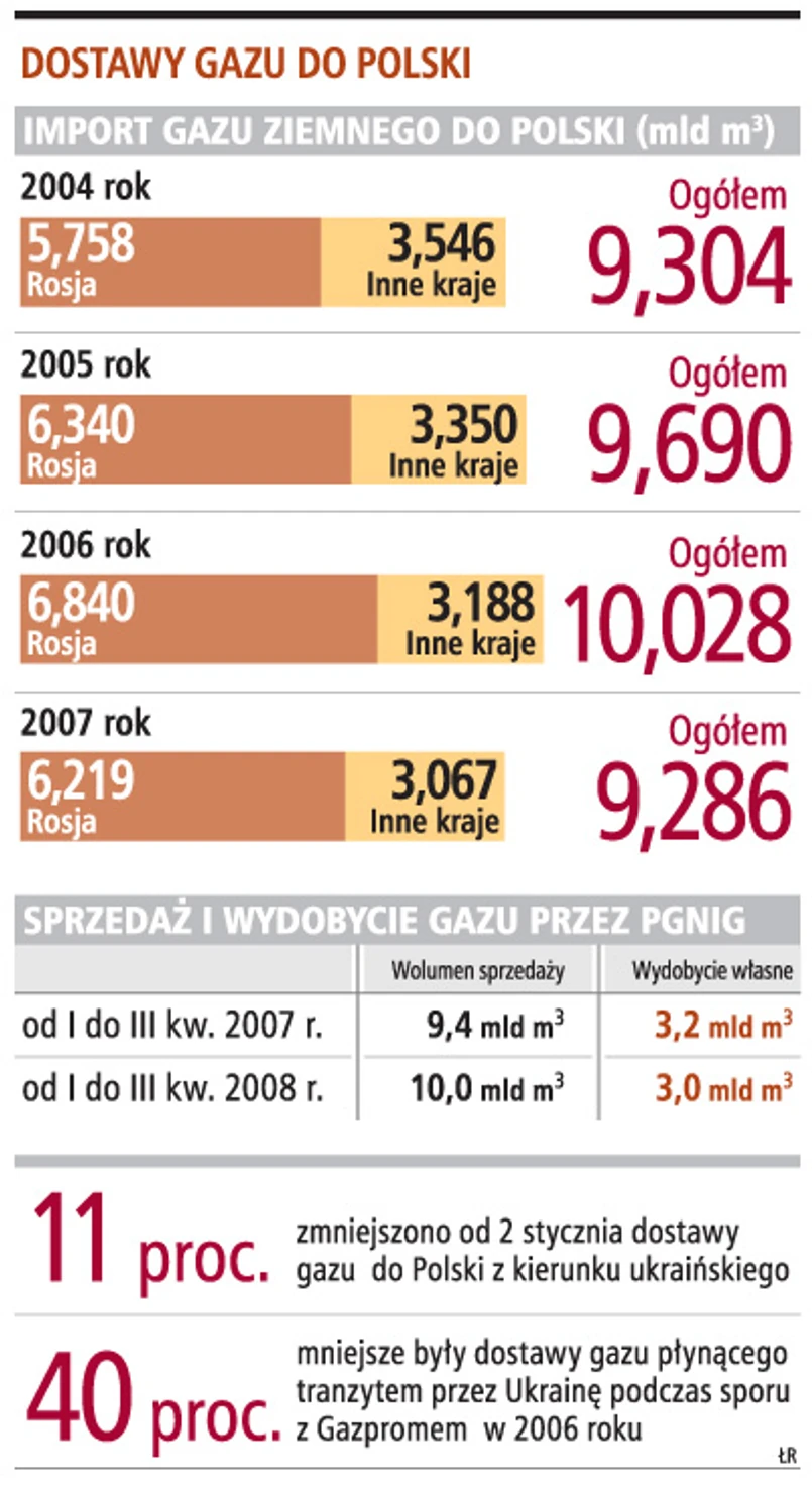 Krajowe wydobycie gazu nie zaspokoi potrzeb. Polskie Górnictwo Naftowe i Gazownictwo przez trzy kwartały 2008 roku wydobyło 3 mld m sześc., przy sprzedaży gazu na poziomie 10 mld m sześc. Ewentualnego braku surowca nie jesteśmy w stanie zrekompensować sobie też zwiększeniem dostaw z innego źródła - blisko 70 proc. gazu zużywanego w naszym kraju pochodzi właśnie z Rosji.