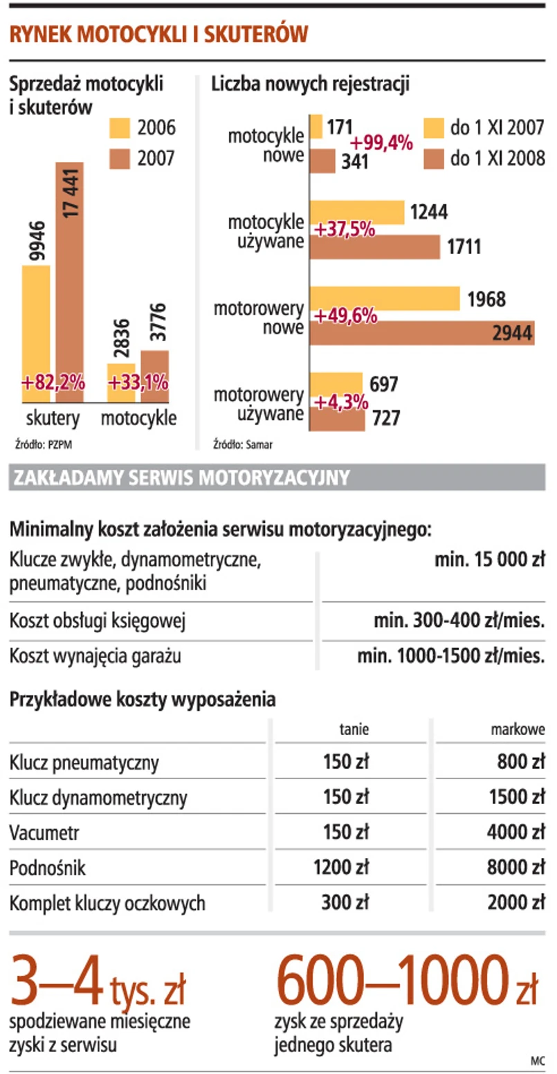Zajmując się tylko naprawą motocykli, przy dobrej lokalizacji i bez zatrudniania pracowników można miesięcznie zarobić ok. 3-4 tys. zł. Oczywiście dotyczy to sezonu, czyli średnio 8 miesięcy w roku. Jeśli będziemy w stanie więcej zainwestować i obok serwisu uruchomimy też sklep ze skuterami i akcesoriami motocyklowymi, to nasze zyski mogą wzrosnąć nawet do 10-15 tys. zł miesięcznie. Nawet jeśli w tym roku sprzedaż jednośladów wyraźnie spadnie, to dochody z serwisu wydają się dość solidną podstawą, która pozwoli przetrzymać spowolnienie gospodarcze.