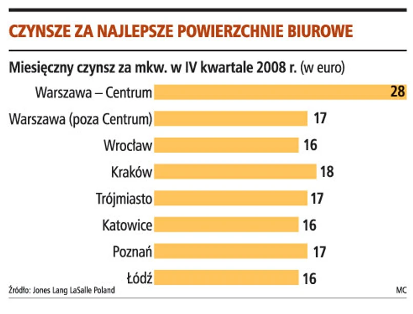 - Stawki za najlepsze powierzchnie w Warszawie spadły z ponad 30 euro do około 28 euro za mkw. miesięcznie. W 2009 roku czynsze w centrum mogą się dalej obniżać - mówi Mateusz Polkowski z Jones Lang LaSalle Poland.