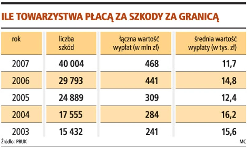 Szacuje się, że w 2008 roku łączna wartość wypłat z polis OC za szkody zagraniczne przekroczyła 0,5 mld zł. Przed naszym wejściem do UE, w 2003 roku, było to dwa razy mniej, około 241 mln zł. Rośnie też liczba takich szkód. Według ostatnich dostępnych danych Polskiego Biura Ubezpieczycieli Komunikacyjnych (PBUK) w 2007 r. było ich już ponad 40 tys., podczas gdy na koniec 2003 roku było nieco ponad 15 tys. wypadków.