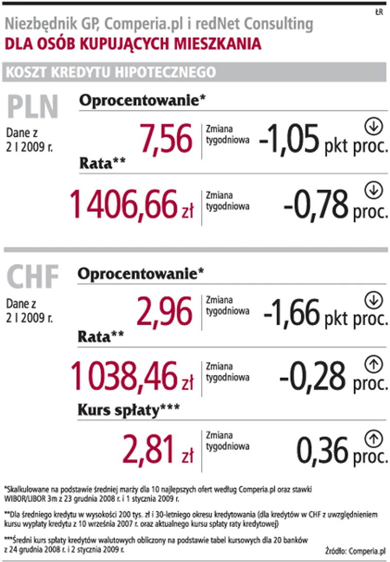Rok 2009 rozpoczął się niewielkimi spadkami rat kredytów hipotecznych we wszystkich walutach. Najwięcej zmieniała się rata w euro, bo w ciągu tygodnia spadła o ponad 25 zł.