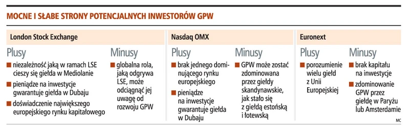 Za wyborem tych dwóch operatorów przemawiają też inne argumenty. Zdaniem byłego prezesa warszawskiej giełdy, Wiesława Rozłuckiego, w wyścigu o GPW liczą się tylko czterej gracze: London Stock Exchange i Nasdaq OMX oraz europejski Euronext i frankfurcka Deutsche Borse. Tę ostatnią skreśla Beata Stelmach, prezes Stowarzyszenia Emitentów Giełdowych. Jej zdaniem ważne jest, aby nowy właściciel GPW gwarantował jej niezależność i dalszy rozwój.