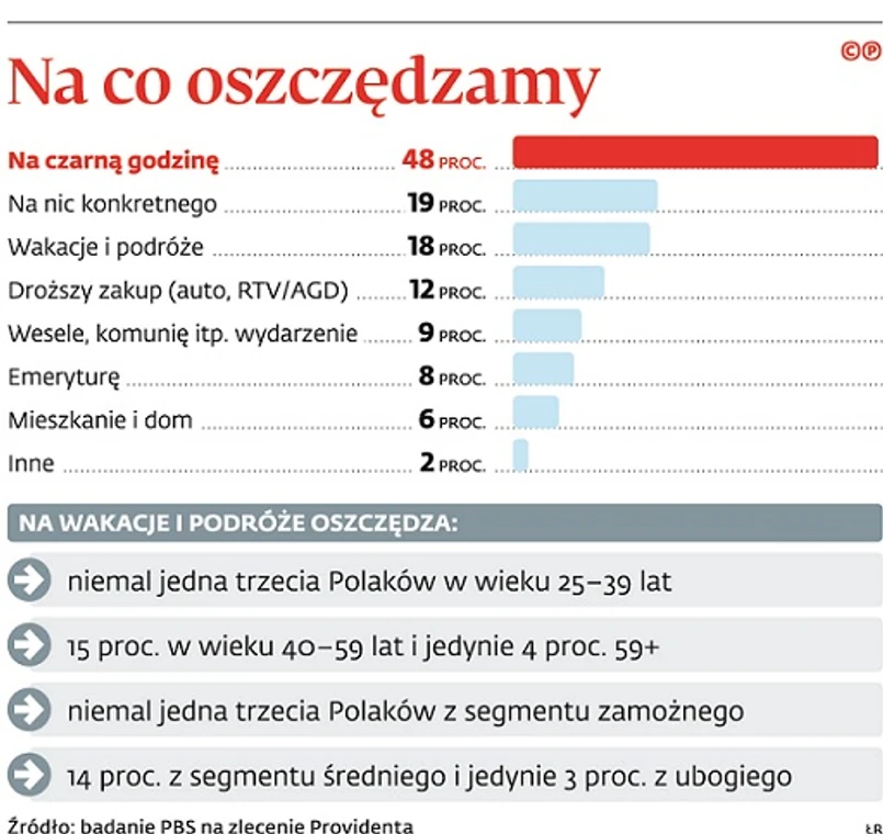 Eksperci zwracają uwagę na jeszcze jedną prawidłowość: w ubiegłym roku aż jedna czwarta osób otrzymujących dodatek na dzieci była w stanie odłożyć stosunkowo dużo, 60 proc. i więcej otrzymywanych środków. To by oznaczało, że program wydatków bieżących nie do końca spełniał swoją rolę, czyli finansowania wydatków bieżących związanych z wychowaniem dzieci. Ten paradoks próbowali wyjaśniać eksperci NBP. Ich zdaniem długofalowy pozytywny wpływ na oszczędności wypłat z 500 plus wcale nie jest taki pewny. W początkowym okresie Polacy mogli bowiem odkładać pieniądze w obawie, że wypłaty są tymczasowe i ustaną np. w związku z pogorszeniem sytuacji w finansach publicznych. Poza tym najmniej zamożni tworzyli bufor finansowy, czego wcześniej nie robili, bo nie mieli z czego. To zresztą cecha charakterystyczna dla społeczeństw na dorobku: często trudno o sprecyzowany cel oszczędzania. Zwracają na to uwagę autorzy badania sporządzonego dla Providenta: niemal połowa osób oszczędności traktuje jako rezerwę na czarną godzinę.