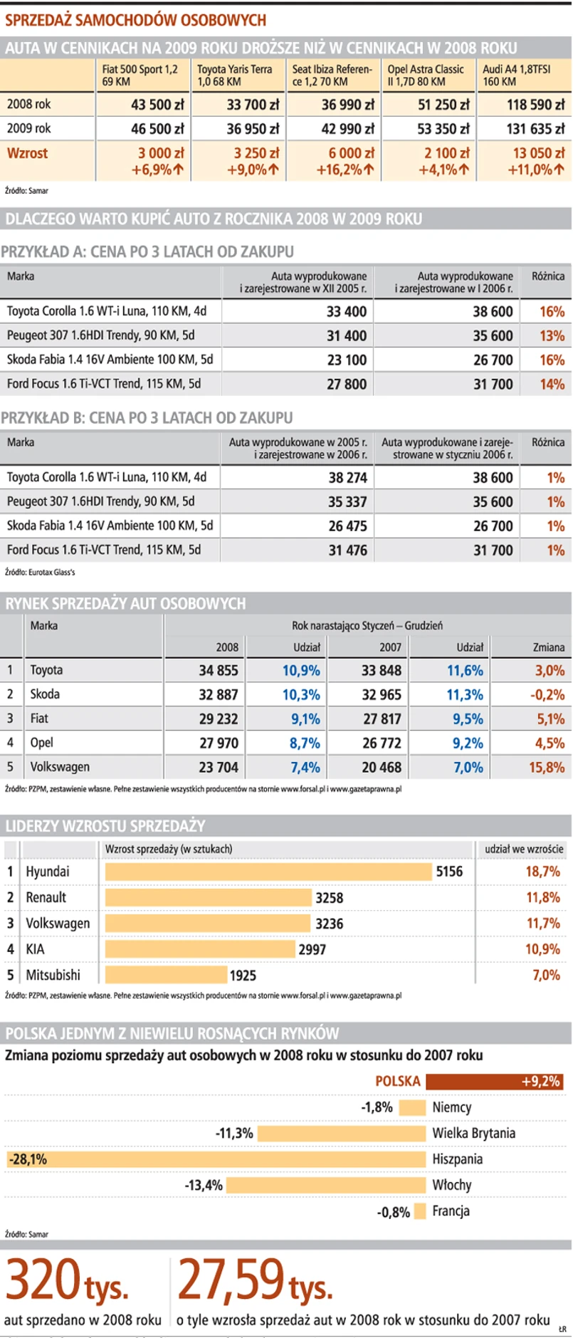 Sprzedawcy aut po podsumowaniu 2008 roku odetchnęli z ulgą. 320 tys. sprzedanych aut, o 9,2 proc. więcej niż w 2007 roku, to na tle innych krajów europejskich dobry wynik. Ankietowani rok temu przez GP przedstawiciele koncernów szacowali poziom sprzedaży na 300-340 tys. sztuk. W tym roku odpowiedzi nie są tak zróżnicowane.