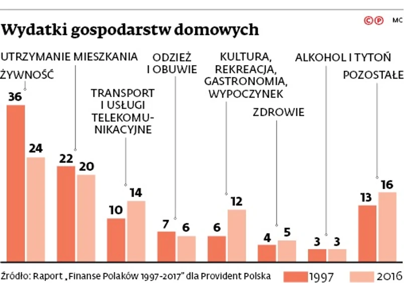 W roku 1997 wydatki na żywność stanowiły ponad jedną trzecią budżetów domowych. Zakup żywności wciąż jest zresztą priorytetem, ale jego waga już nie jest tak duża. W ubiegłorocznych wydatkach gospodarstw domowych zakup żywności stanowił ok. 24 proc. Koszty utrzymania mieszkania pochłaniały zaś jedną piątą domowego budżetu. 20 lat temu było to 22 proc., więc tu zmiana jest niewielka. Największą różnicę widać w udziale wydatków na takie kategorie, jak transport i usługi telekomunikacyjne oraz kultura, gastronomia czy wypoczynek, które na przestrzeni minionych 20 lat znacząco wzrosły.