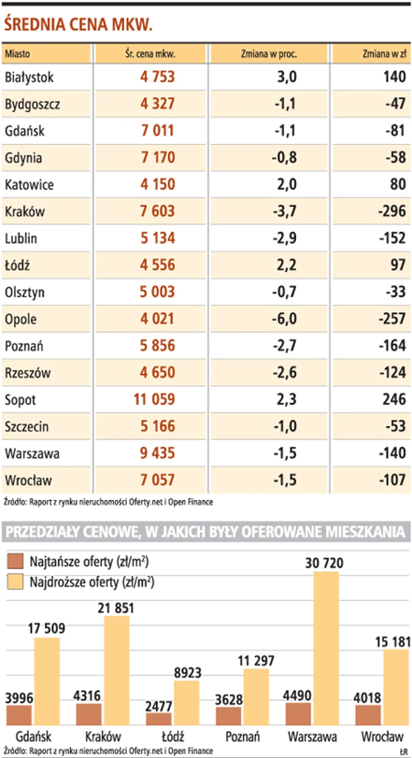 Najbardziej metr mieszkania zdrożał w Białymstoku, bo o 3 proc., czyli o 140 zł. Najbardziej spadły ceny w Opolu - o 6 proc., czyli o ok. 250 zł za mkw. Nadal trzeba płacić za mieszkanie w Sopocie, bo mkw. zdrożał tam o 240 zł i kosztuje już ponad 11 tys. zł.