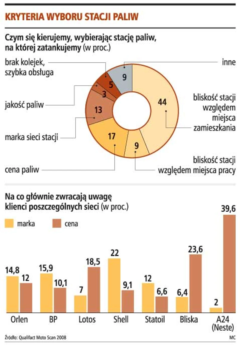 Kryterium to nie już aż tak ważne dla osób tankujących na stacjach zachodnich koncernów (Shell, BP, Statoil). Jak podaje Moto Scan, ci klienci dużą wagę przywiązują bowiem do marki sieci. Tylko ze względu na markę na stacjach Shella tankuje prawie co czwarty klient tej sieci.