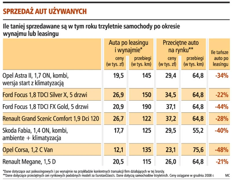 Trzeba też pamiętać, że przeciętne auto po leasingu lub wynajmie jest najczęściej białe, podczas gdy klienci indywidualni wybierają inne kolory. Jednak jeśli przejrzy się oferty na stronach firm leasingowych lub wynajmu, to łatwo się przekonać, że wybór jest coraz większy. Można też znaleźć auta ze stosunkowo małym przebiegiem, używane np. przez średnią kadrę zarządzającą, a nie sprzedawców, a nadal tańsze od przeciętnej rynkowej. Plusem jest też to, że auto jest regularnie serwisowane. To dobry czas na zakup auta używanego, bo spadek cen nowych aut przekłada się od razu na niższe ceny samochodów używanych. Z naszego grudniowego zestawienia przykładowych cen transakcji dla określonych modeli samochodów po leasingu i wynajmie wynika, że firmy uzyskiwały pod koniec 2008 roku ceny przeciętnie o 10-20 proc. niższe niż rok wcześniej.