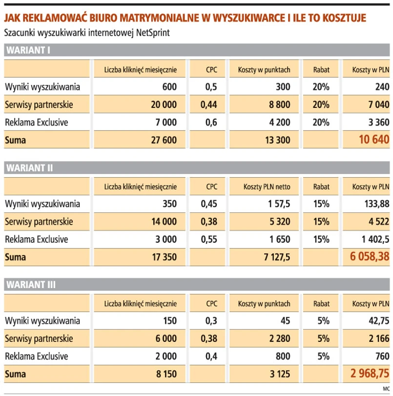 • Warto pomyśleć o ciekawej stronie internetowej. Choć bowiem biur matrymonialnych w samej tylko stolicy w wyszukiwarce internetowej znaleźć można tysiące, niewiele ma jednak strony internetowe. A to, w zależności od jakości i zaawansowania strony, kosztować może jednorazowo od 2-3 tys. zł do nawet kilkunastu tysięcy złotych.