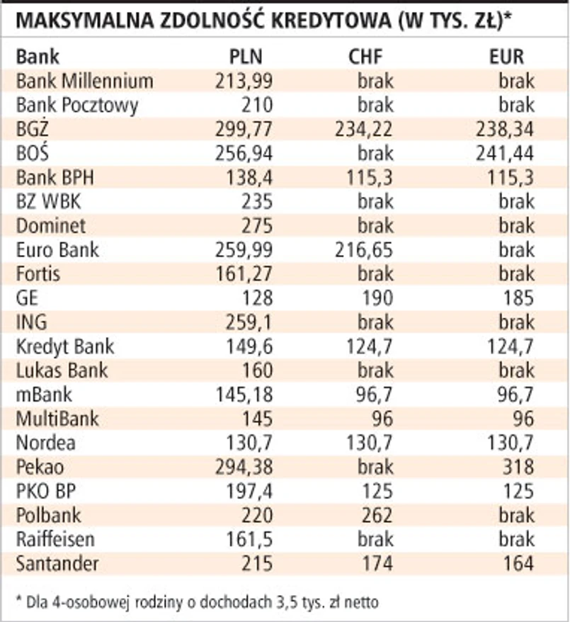 Decydując się na kredyt w euro, nie można również zapomnieć, że zdolność kredytowa w przypadku kredytu w walucie obcej jest zwykle niższa niż przy kredycie w złotych. Czteroosobowa rodzina o dochodzie 3,5 tys. zł netto może liczyć średnio na 201 tys. zł kredytu w złotych. Są jednak banki, które udzielą im kredytu na ponad 290 tys. zł, np. Pekao. Najmniej, 128 tys. zł, przyzna GE Money Bank. Średnia zdolność w przypadku franków wynosi około 160 tys. zł, a w euro około 166 tys. zł.