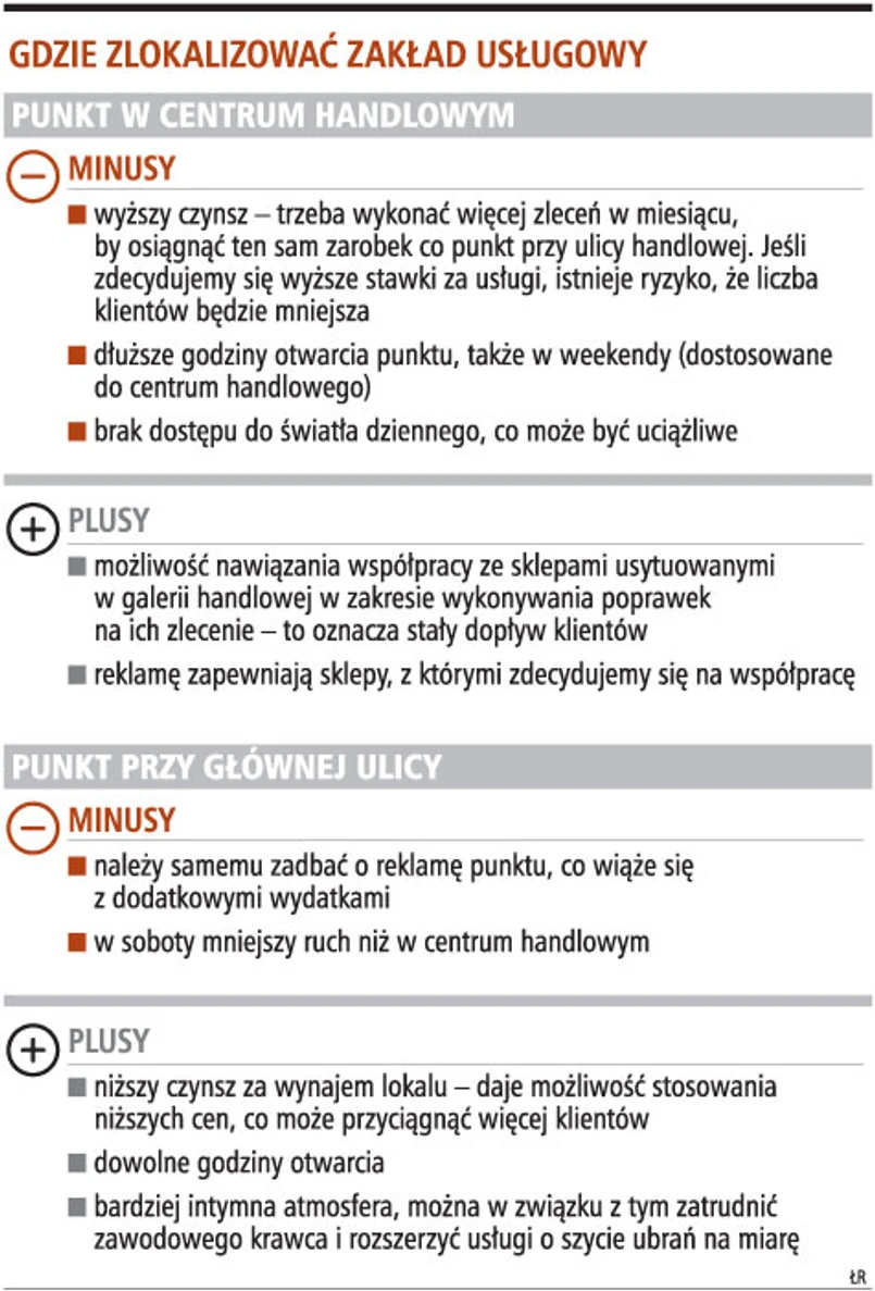 Minusem działalności poza centrum handlowym jest dużo trudniejsze pozyskanie zleceń. Na współpracę ze sklepami odzieżowymi można liczyć, jeśli takie są w pobliżu. Na pewno możemy oczekiwać przypadkowych klientów, którym akurat rozpruła się spódnica, spodnie czy zepsuł się zamek. W przypadku tak zlokalizowanego punktu istotna jest więc dobra reklama, by zdobyć zamówienia. Można zainwestować we własną stronę internetową. Innym rozwiązaniem są ulotki reklamujące punkt. Niezależnie od tego warto zainwestować w widoczny, przyciągający wzrok szyld. Szczególnie gdy nasz punkt nie będzie miał wejścia bezpośrednio od ulicy. W pierwszych miesiącach po uruchomieniu na reklamę trzeba przeznaczyć co najmniej kilkaset złotych miesięcznie.