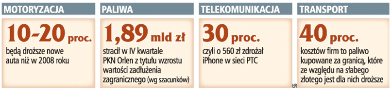 Gwałtowne osłabnie złotego, szczególnie wobec dolara, negatywnie odbija się na dystrybutorach sprzętu IT. Większość produktów, które oferują oni w Polsce, jest produkowana na Dalekim Wschodzie. Spółki muszą za nie płacić dolarami. Tymczasem ta waluta umocniła się od sierpnia 2008 r. w stosunku do złotego o ponad 70 proc.