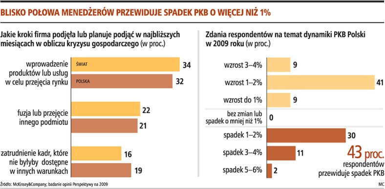 Ścięcie kosztów operacyjnych, czyli kosztów bieżącej działalności, to priorytet dla 85 proc. badanych przez McKinsey. To o 10 proc. większy wynik niż w przypadku takiego samego badania wykonanego w światowych firmach. Więcej polskich menedżerów wskazuje też konieczności redukcji inwestycji, a także restrukturyzację.