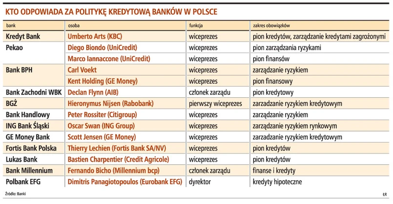 Faktem jest, że większość banków znacznie zaostrzyła warunki udzielania kredytów. Faktem jest też, że w większości przypadków za politykę kredytową odpowiadają bezpośredni przedstawiciele zagranicznych inwestorów w zarządach polskich banków. O ile w samych zarządach banków pracowników oddelegowanych do pracy w Polsce (tzw. ekspatów) przez zagranicznych inwestorów jest stosunkowo niewielu - w największych bankach tylko jeden obcokrajowiec piastuje funkcję prezesa (Alexander Paklons w Fortis Bank Polska), o tyle regułą stało się, że to oni odpowiadają za zarządzaniem ryzykiem kredytowym.