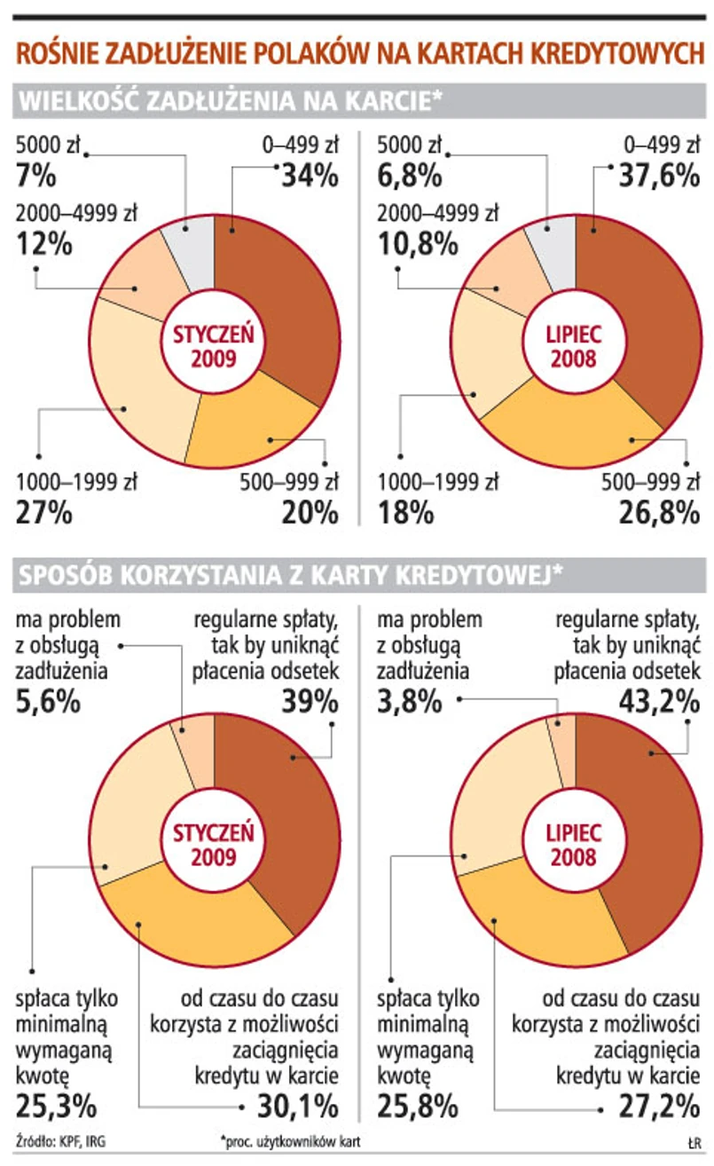 Na koniec stycznia odsetek osób mających problemy z obsługą swoich zobowiązań wzrósł do 5,6 proc. z 3,8 proc. na koniec lipca ubiegłego roku - wynika z badań przeprowadzonych wśród osób posługujących się kartami kredytowymi przez Konferencję Przedsiębiorstw Finansowych oraz Instytut Rozwoju Gospodarczego. Coraz więcej osób korzysta też z przyznanego im kredytu i nie spłaca swoich zobowiązań w tzw. okresie bezodsetkowym (na ogół jest to 50-56 dni). I to pomimo tego że kredyty na kartach tradycyjnie należą do najdroższych wśród wszystkich pożyczek - nierzadko oprocentowanie przekracza 20 proc. To niewiele mniej niż wynosi limit oprocentowania pożyczek ustalony przez ustawę antylichwiarską. Obecnie ten limit wynosi 23 proc.