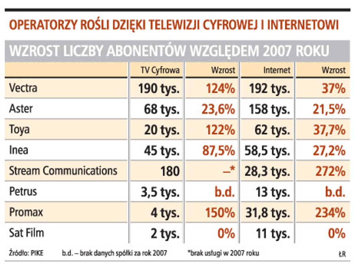 W 2008 roku wzrost liczby abonentów, którzy wybrali droższą i szerszą pod względem liczby kanałów ofertę telewizji cyfrowej, wyniósł 80-150 proc. w zależności od operatora. Również w tempie dwucyfrowym zwiększała się liczba klientów internetu.