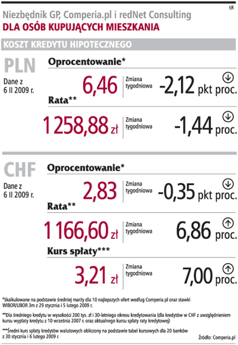 Dobra passa klientów, którzy spłacają raty w złotym, trwa. Wyliczona przez porównywarkę Comperię.pl rata przykładowego kredytu hipotecznego w złotym po raz kolejny spadła. Tym razem zmiana tygodniowa wyniosła prawie 20 zł, co dało ratę w wysokości 1258,88 zł.