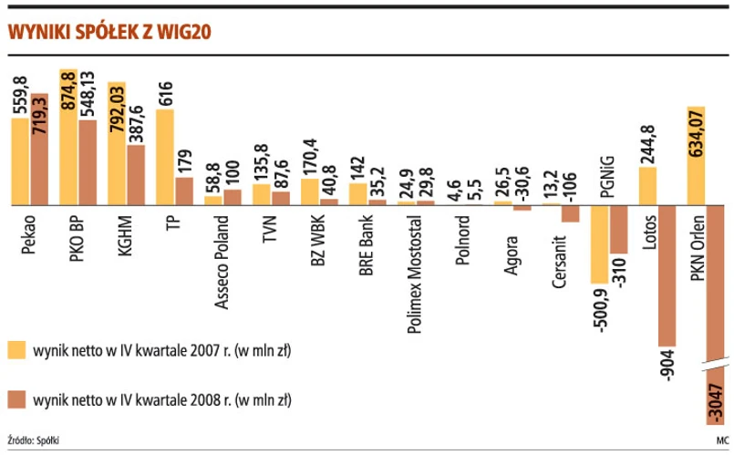 Łączny wynik 15 spółek z WIG20, które do poniedziałkowej sesji przedstawiły raporty za IV kwartał, jest gorszy od oczekiwań. Ich strata netto przekroczyła 2,26 mld zł, mimo że zysk netto osiągnęło 10 firm. W IV kwartale 2007 r. stratę zanotował tylko PGNiG, a łączny zysk netto firm z WIG20 wyniósł 3,8 mld zł. Wyniki czterech spółek (poznamy je dzisiaj rano) nie powinny wpłynąć na zmniejszenie straty.