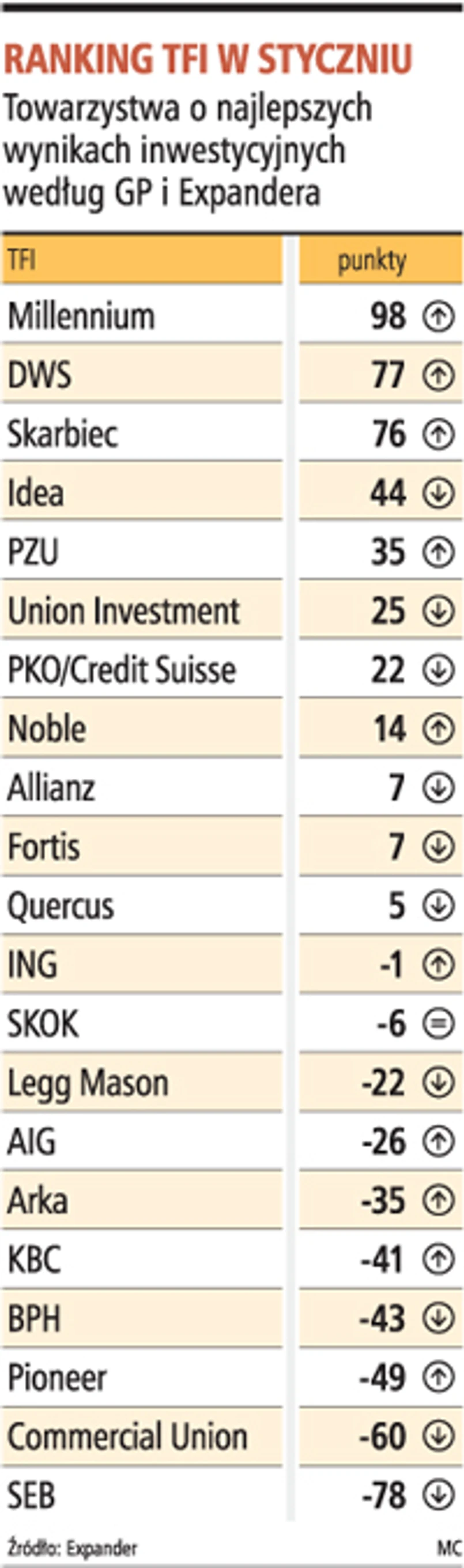W rankingu GP i Expandera w lutym pierwsze miejsce zajęło Millennium TFI (98 pkt), które zyskało m.in. dzięki wynikom Millennium BRIC (FZ SFIO) i Millennium Dynamiczny USD (FZ SFIO). Najgorzej w rankingu wypadło SEB TFI (-78 pkt). To efekt słabych wyników m.in. SEB Wschodnioeuropejskiego oraz SEB Japońskiego. Wkrótce zarządzanie funduszami inwestycyjnymi SEB TFI powinna przejąć Opera TFI. Do przejęcia dojdzie, jeśli na transakcję zgodzi się Urząd Ochrony Konkurencji i Konsumentów.