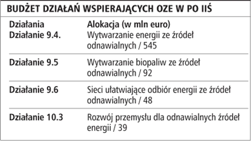 Jednocześnie fundusze na innowacyjne przedsięwzięcia w zakresie odnawialnych źródeł energii można pozyskać z Programu Innowacyjna Gospodarka, a na mniejsze projekty produkcji biopaliw i biokomponentów w ramach Programu Rozwoju Obszarów Wiejskich. Projekty OZE o niższej wartości dofinansowywane są też w ramach niektórych Regionalnych Programów Operacyjnych.