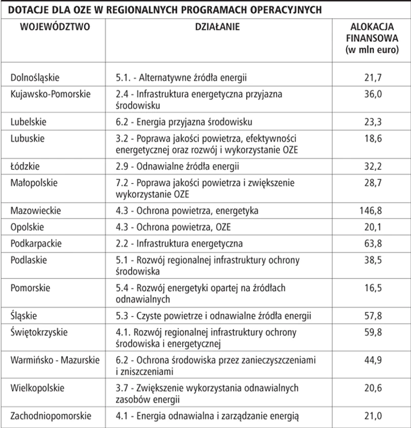 W ramach RPO mogą być dofinansowywane projekty o wartości poniżej 20 mln (lub 10 mln zł w przypadku małych elektrowni wodnych do 10 MW oraz w zakresie wytwarzania energii elektrycznej z biomasy lub biogazu). Praktycznie każdy region przeznaczył część środków unijnych, które otrzymał na lata 2007-2013 na odnawialne źródła energii. Nie są to duże kwoty (patrz tabela), lecz stanowią istotne uzupełnienie środków w programie Infrastruktura i Środowisko.