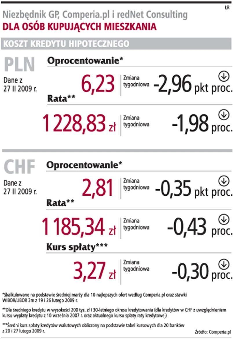 Ubiegły tydzień przyniósł kolejny spadek raty kredytu hipotecznego w złotym. Wyliczona przez Comperię.pl, rata przykładowego kredytu zmniejszyła się o prawie 25 zł i wyniosła 1228,83 zł. Oprocentowanie spadło aż o 0,19 pkt proc.