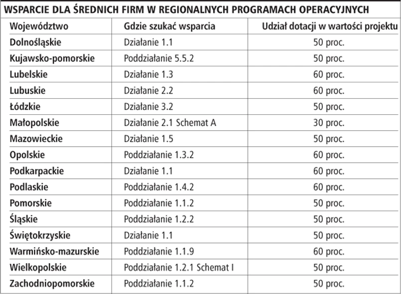 Największe możliwości uzyskania wsparcia z UE będą miały w przyszłym roku mikroprzedsiębiorstwa. Praktycznie każde województwo planuje dla nich konkurs. Gorzej wygląda sytuacja z większymi firmami. W części regionów w ogóle nie będzie dla nich pieniędzy. Na unijne dotacje nie mogą natomiast liczyć w tym roku średniej wielkości przedsiębiorcy na Mazowszu. Władze tego województwa zaplanowały, że oprócz specjalistycznych dotacji na informatyzację oraz branżę turystyczną będą wspierane najmniejsze firmy, które chcą realizować projekty o wartości do 40 tys. zł.