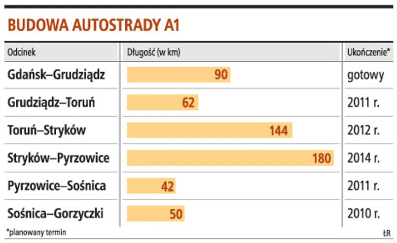 Zgodnie z umową podpisaną z Ministerstwem Infrastruktury w grudniu 2008 r., spółka GTC na wybudowanie 62-km odcinka autostrady ma czas do końca 2011 roku. Umowa zakłada dotkliwe kary w przypadku niedotrzymania terminu. Jakie, strony nie chcą zdradzić. Kontrakt na realizację pierwszego odcinka A1 do Grudziądza przewidywał kary około 90 tys. euro za każdy dzień zwłoki.