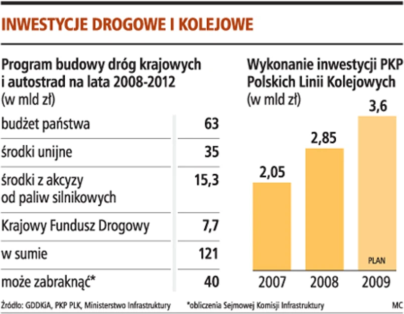 Według naszych informacji zagrożone jest także rozpoczęcie w tym roku innej wielkiej inwestycji - drugiego etapu modernizacji linii kolejowej z Warszawy do Łodzi, czyli torów ze stolicy do Skierniewic. Jeszcze kilka miesięcy temu PKP Polskie Linie Kolejowe, odpowiedzialne za infrastrukturę kolejową, zapewniały, że prace rozpoczną się w 2009 roku i zakończą w 2012 roku. Teraz Krzysztof Łańcucki z PKP PLK nad inwestycją stawia znak zapytania.