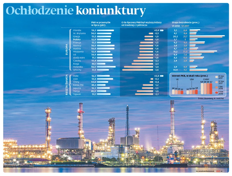 Wskazuje na to opublikowany wczoraj wskaźnik PMI obrazujący koniunkturę w sektorze przetwórczym. Problem nie dotyczy jednak wyłącznie Polski. W większości krajów europejskich przemysłowy PMI był w lipcu niżej niż średnio w pierwszej połowie roku. Podobnie było w dużych gospodarkach poza Europą.