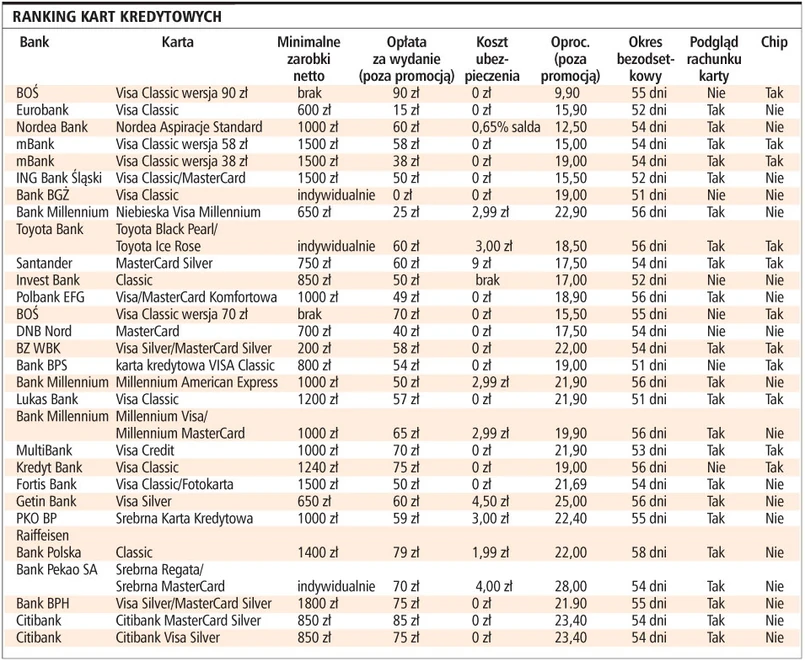Poza oprocentowaniem i opłatami za kartę dodatkowe punkty przyznawaliśmy za zapewnienie klientom poglądu rachunku karty przez internet, długość okresu grace period oraz posiadanie chipa. Polskie banki powoli wdrażają technologię chipową. Z największych banków dotychczas chip wprowadził Kredyt Bank, Bank Zachodni WBK, Lukas Bank, a ostatnio także mBank i MultiBank. Chip na karcie zapewnia swojemu posiadaczowi większe bezpieczeństwo. Przestępcy nie mają bowiem możliwości skopiowania chipa, co dziś często zdarza się w przypadku kart z paskiem magnetycznym.