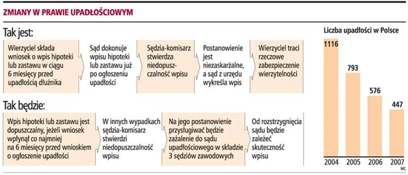 Komisja ustawodawcza Senatu przedstawiła projekt nowelizacji ustawy Prawo upadłościowe i naprawcze (dalej: ustawa), który wprowadza możliwość zaskarżenia postanowienia sędziego komisarza o niedopuszczalności wpisu hipoteki lub zastawu w księdze wieczystej lub rejestrze po ogłoszeniu upadłości dłużnika. Takie postanowienie jest podstawą do wykreślenia wpisu z urzędu przez sąd rejestrowy lub ksiąg wieczystych. Projekt jest skutkiem wyroku Trybunału Konstytucyjnego (TK) z 19 września 2007 r. (sygn. akt SK 4/06), zgodnie z którym art. 82 ustawy w zakresie, w jakim nie przewiduje sądowej kontroli zgodności z prawem takiego postanowienia sędziego komisarza, jest sprzeczny z konstytucją.