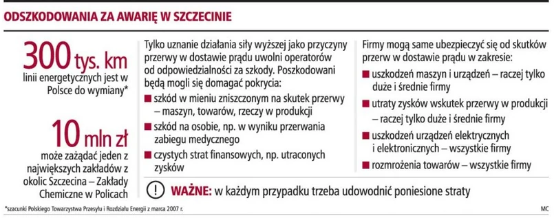 Jeśli poszkodowani będą mieli podstawy do zgłaszania roszczeń, może to być problem dla firm, które potencjalnie będą za nie odpowiedzialne, czyli PSE Operator i Enea Operator. Jeśli mają dobre polisy, roszczenia może regulować ubezpieczyciel. Wczoraj obie firmy nie potrafiły nam powiedzieć, jaki jest zakres ich polis.