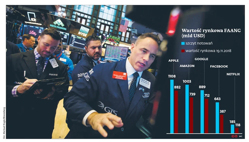 Te pięć firm w swoich szczytowych momentach miało łączną wartość rynkową przekraczającą 3,83 bln dol. To 26-krotność wartości wszystkich polskich spółek notowanych na warszawskiej giełdzie. Dziś są one warte o 989 mld dol. mniej. To oznacza, że teraz, kiedy spółki te tracą na wartości po kilkadziesiąt procent, zmienia się trend nie tylko dla nich i reszty branży technologicznej, ale dla całego amerykańskiego rynku giełdowego. To najważniejszy rynek finansowy świata. To, co się na nim dzieje, ma wpływ na wszystkie inne rynki. Jeśli więc szukamy przyczyn pogorszenia się nastrojów także na giełdzie w Warszawie, nie możemy pominąć tego, co się właśnie dzieje z Google’em, Apple’em, Amazonem, Facebookiem i Netflixem.