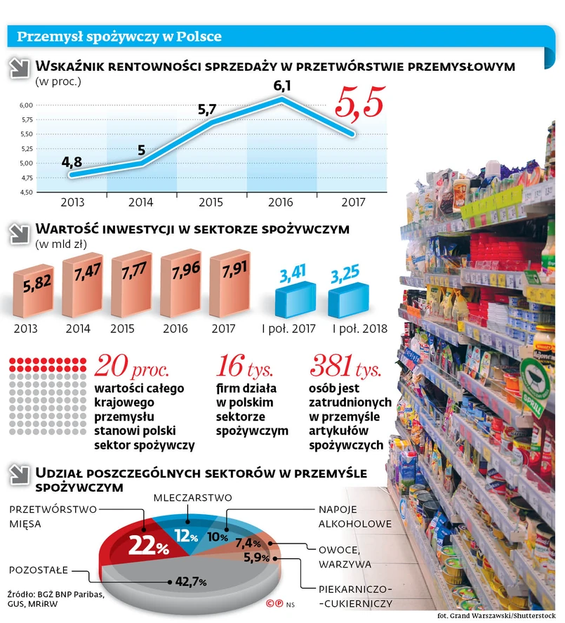 Paweł Wyrzykowski, analityk Banku BGŻ BNP Paribas, dodaje, że spadek inwestycji nastąpił m.in. w przetwórstwie owoców i warzyw oraz w przetwórstwie mięsa czerwonego. – W przypadku pierwszego sektora było to związane z niskimi zbiorami w 2017 r., które przełożyły się na drastyczny wzrost cen w sezonie 2017/2018. W związku z tym, że przedsiębiorcy zmuszeni zostali do przekierowania większych środków na zakup surowców, powstrzymali się od inwestycji – komentuje Paweł Wyrzykowski.