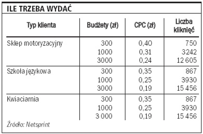 Stawki za jedno kliknięcie wynoszą średnio od 0,19 do 0,45 gr. To tzw. koszt kliknięcia, czyli CPC (Cost per Click). Nie gwarantuje on co prawda, że jeśli klient kliknie na nasz link i wejdzie na stronę sklepu, zostawi u nas pieniądze. Jednak dokładnie wiemy, ile osób weszło na naszą stronę dzięki reklamie w wyszukiwarce i ile z nich dokonało zakupu. W ten sposób policzyć można skuteczność reklamy.