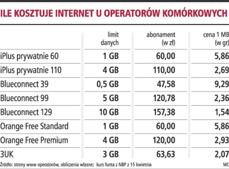 Jeśli ktoś chce używać bezprzewodowego dostępu do internetu oferowanego przez sieci komórkowe nie tylko do przeglądania poczty i okazyjnego surfowania po sieci, musi się liczyć z wydatkiem ok. 120 zł miesięcznie. Otrzymuje wtedy możliwość przesłania od 4 GB do 5 GB danych miesięcznie. Wówczas 1 MB - w zależności od sieci - kosztuje od 2,36 gr (sieć Era, usługa Blueconnect 99) do 2,93 gr (sieć Orange, usługa Orange Free Premium).