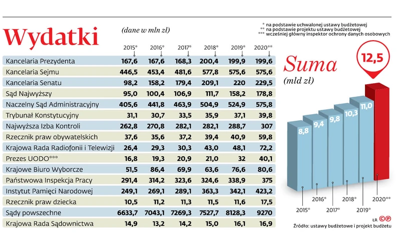Ogółem wśród 16 instytucji zaliczanych do tej kategorii cztery zaprogramowały wydatki nie wyższe niż w tym roku. Oprócz wspomnianych Kancelarii Prezydenta, Sejmu i Senatu to jeszcze Sąd Najwyższy. Reszta prognozuje wzrost wydatków. Łącznie w przyszłym roku tzw. święte krowy zaplanowały, że ich budżety zwiększą się o do 12,5 mld zł, czyli o przeszło 13 proc. W 2020 r. najbardziej miałby urosnąć budżet Krajowej Rady Radiofonii i Telewizji i rzecznika praw dziecka – w obu przypadkach o ponad 50 proc. O ponad 46 proc. u rzecznika praw obywatelskich.