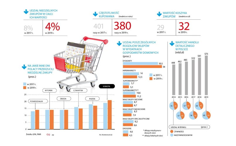 Nastąpiło to jednak nie tylko kosztem niedziel, lecz także pozostałych dni. – W 2019 r. udział niedzielnych zakupów był o połowę mniejszy niż w 2017 r., czyli przed wprowadzeniem obostrzeń. Wynosił zaledwie 4 proc. Jako konsumenci przerzuciliśmy się więc płynnie na inne dni tygodnia – potwierdza Michał Maksymiec, dyrektor współpracy z sieciami detalicznymi Panelu Gospodarstw Domowych GfK Polonia.