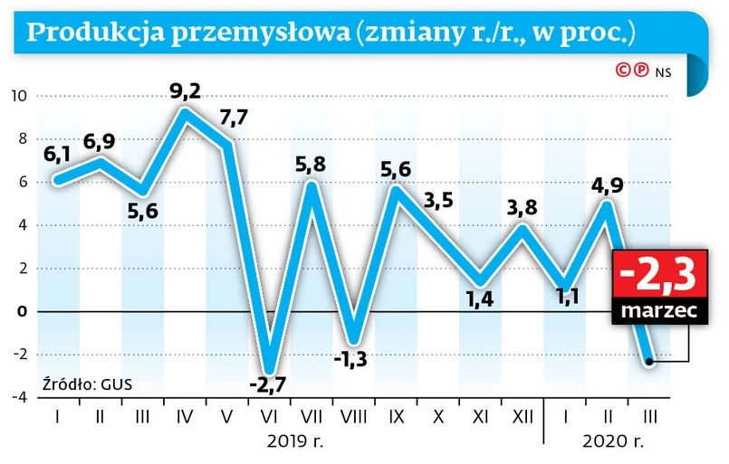 Choć to nie przemysł jest na pierwszej linii walki z pandemią, to jednak i na nim odciska ona swoje piętno. W marcu wyprodukował o 2,3 proc. mniej niż rok wcześniej.
