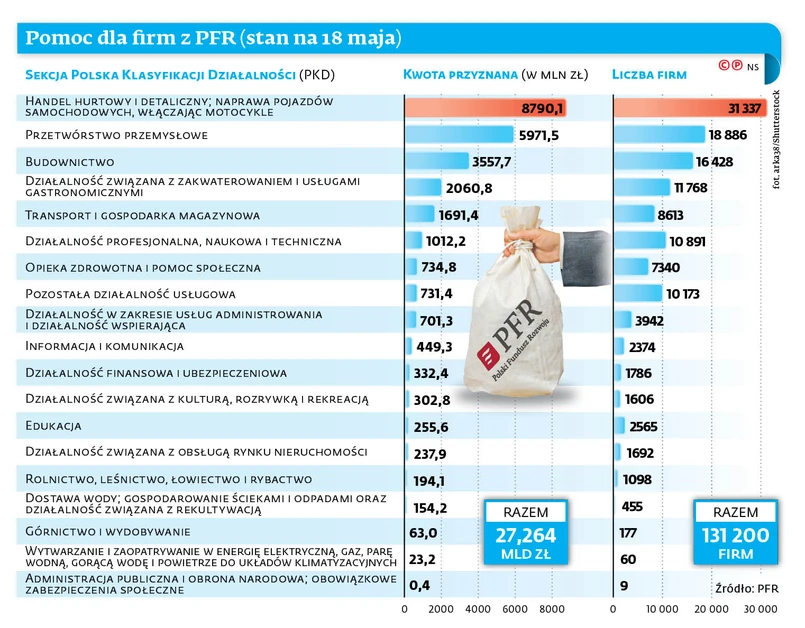 Tarcza Finansowa PFR jest najlepiej ocenianą przez ekspertów odpowiedzią rządu na kryzys, jaki wywołał koronawirus. Popyt na subwencje ze strony mikro, małych i średnich podmiotów jest duży. Z informacji, jakie uzyskaliśmy w Funduszu, wynika, że blisko jedna trzecia pomocy jak na razie trafiła do firm zajmujących się handel hurtowym i detalicznym, w tym naprawą pojazdów samochodowych. Kolejne na liście z prawie 22 proc. udziałem jest przetwórstwo przemysłowe, a na podium łapie się jeszcze budowlanka (13 proc.).