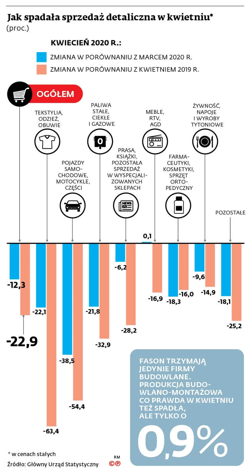 Sprzedaż detaliczna była w kwietniu o 22,9 proc. mniejsza niż rok wcześniej – podał w piątek Główny Urząd Statystyczny. Ekonomiści zakładali raczej, że spadek nie przekroczy 20 proc. Najgorzej miały się