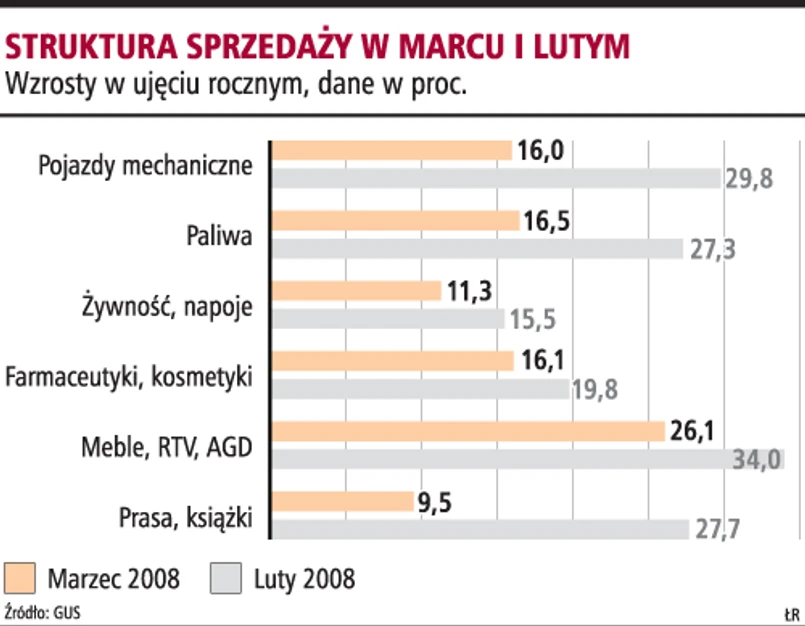 Spadki sprzedaży zanotowano we wszystkich kategoriach, ale dużą niespodzianką jest wyraźne obniżenie w kategorii prasa i książki do 9,5 proc. z 27,7 proc. w lutym.