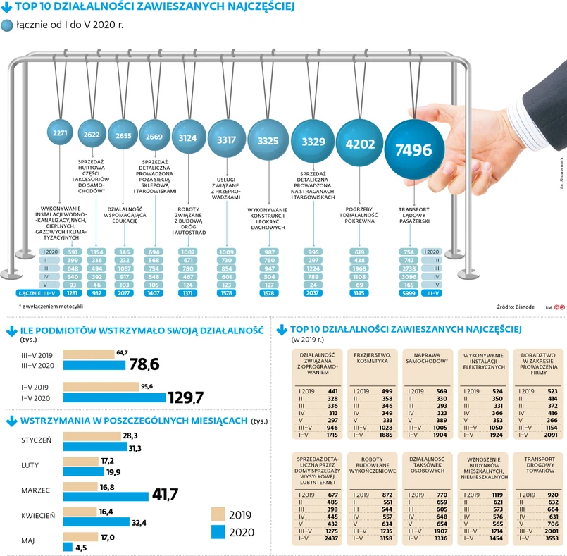 Z powodu COVID-19, czyli od marca do maja, najwięcej zostało zawieszonych przedsiębiorstw taksówkowych ‒ niemal 6 tys. To trzy razy tyle, ile przed rokiem. Na drugim miejscu znalazła się działalność związana z pogrzebami ‒ 3,1 tys., a pierwszą trójkę zamyka sprzedaż detaliczna na bazarach i targowiskach ‒ 2 tys. Tym samym nastąpiło przetasowanie w tej grupie. W ubiegłym roku bowiem, w tym samym czasie najczęściej na wstrzymanie biznesu decydowali się przedsiębiorcy specjalizujący się w transporcie drogowym. Drugie miejsce należało do firm z branży robót budowlanych związanych z budownictwem mieszkaniowym i niemieszkaniowym, a trzecie do taksówek osobowych.